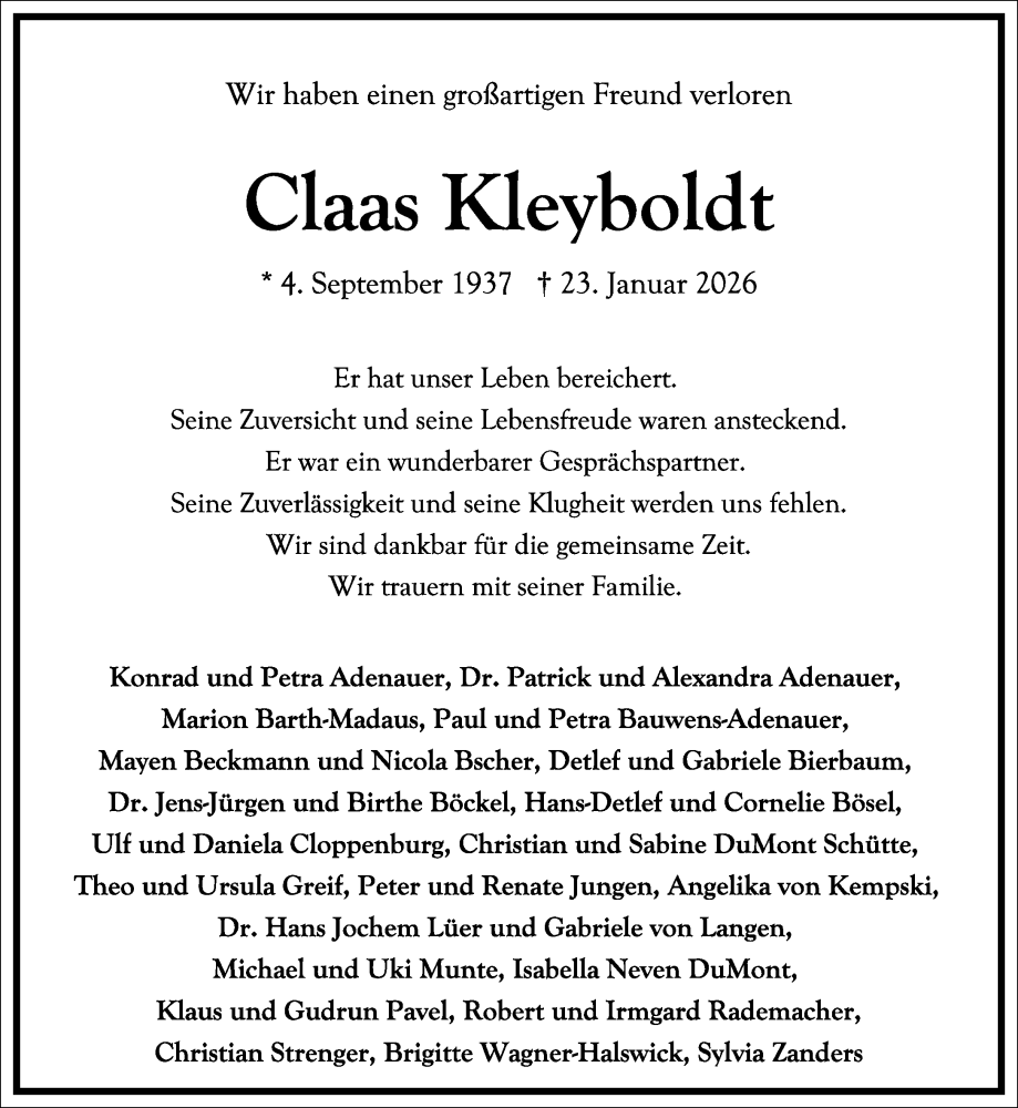 Hier finden Sie alle Traueranzeigen aus der Zeitung, die bisher für Claas Kleyboldt erschienen sind. Weitere Traueranzeigen, die in der Zeitung erscheinen, werden hier ebenfalls aufgelistet