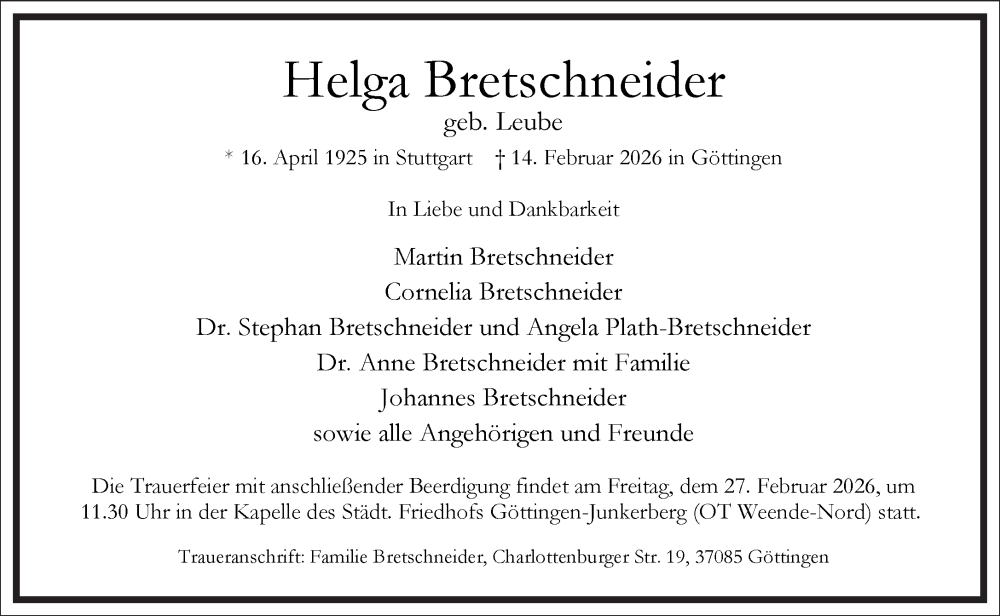 Hier finden Sie alle Traueranzeigen aus der Zeitung, die bisher für Helga Bretschneider erschienen sind. Weitere Traueranzeigen, die in der Zeitung erscheinen, werden hier ebenfalls aufgelistet