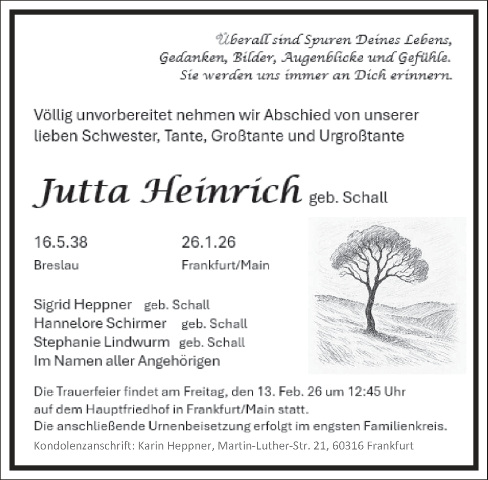 Hier finden Sie alle Traueranzeigen aus der Zeitung, die bisher für Jutta Heinrich erschienen sind. Weitere Traueranzeigen, die in der Zeitung erscheinen, werden hier ebenfalls aufgelistet