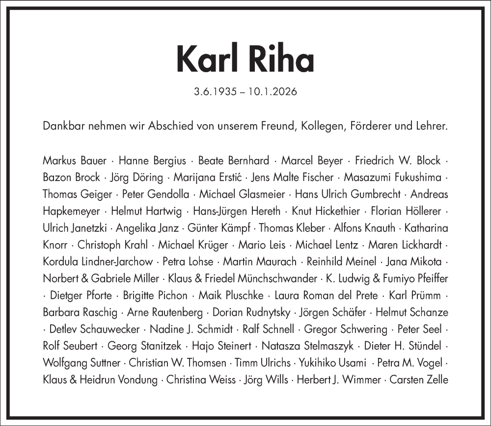 Hier finden Sie alle Traueranzeigen aus der Zeitung, die bisher für Karl Riha erschienen sind. Weitere Traueranzeigen, die in der Zeitung erscheinen, werden hier ebenfalls aufgelistet