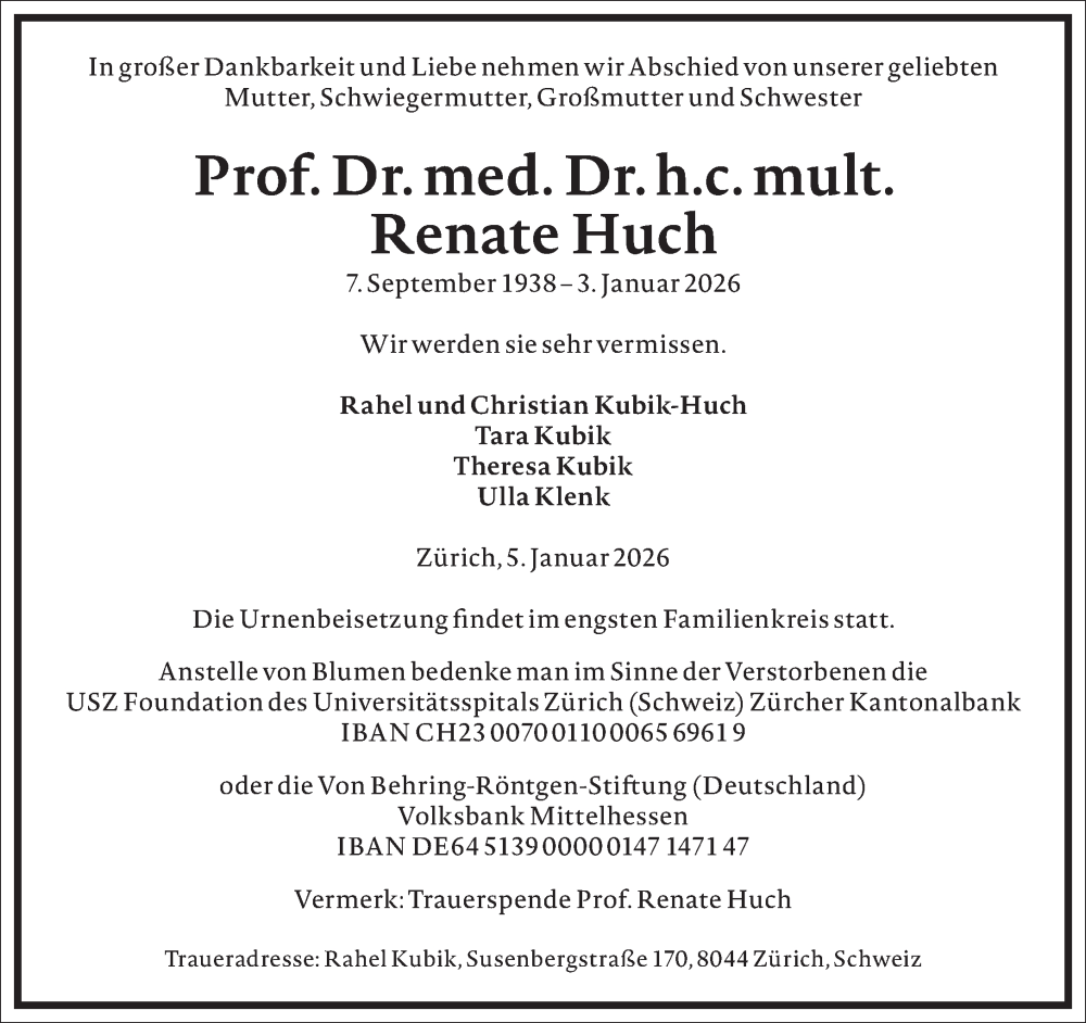 Hier finden Sie alle Traueranzeigen aus der Zeitung, die bisher für Renate Huch erschienen sind. Weitere Traueranzeigen, die in der Zeitung erscheinen, werden hier ebenfalls aufgelistet