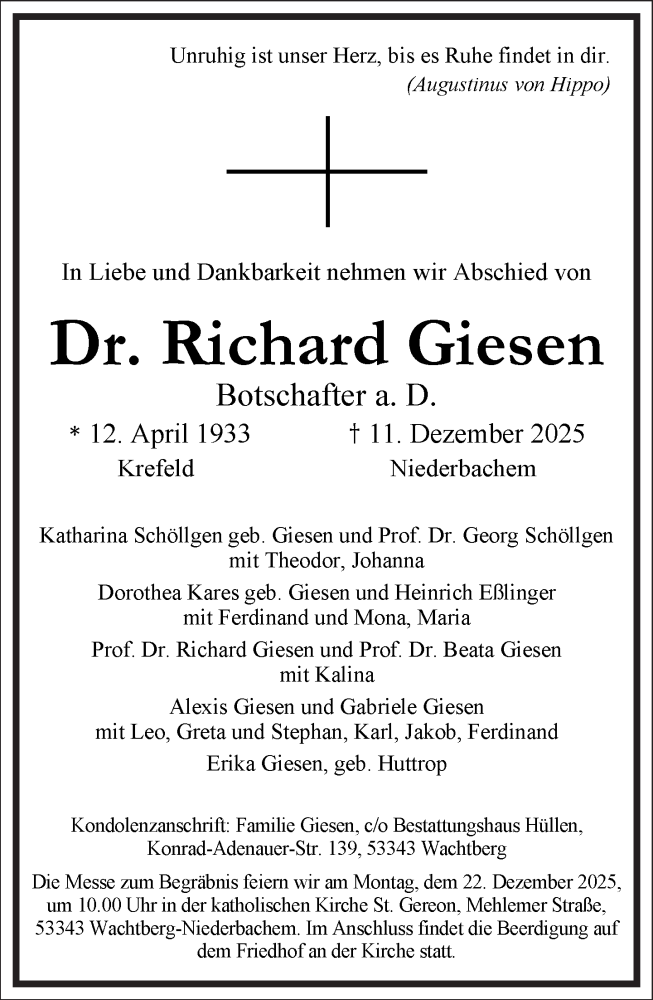 Hier finden Sie alle Traueranzeigen aus der Zeitung, die bisher für Richard Giesen erschienen sind. Weitere Traueranzeigen, die in der Zeitung erscheinen, werden hier ebenfalls aufgelistet